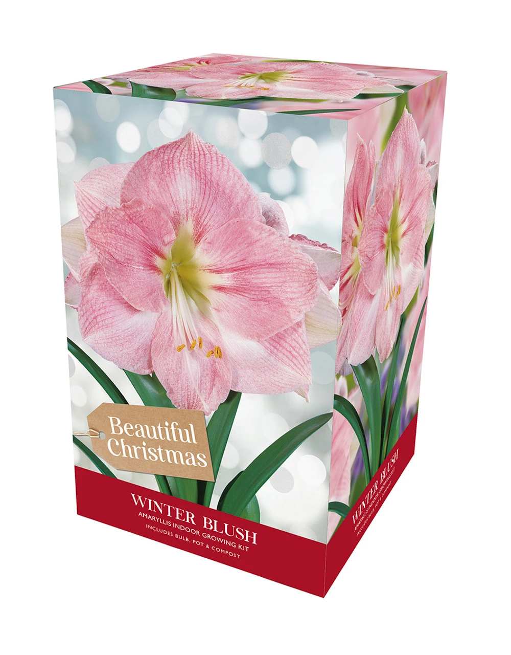 The Winter Blush Amaryllis has soft pink flowers. This Amaryllis comes complete with a pot, bulb, and compost. This indoor growing plant contains 1 bulb.