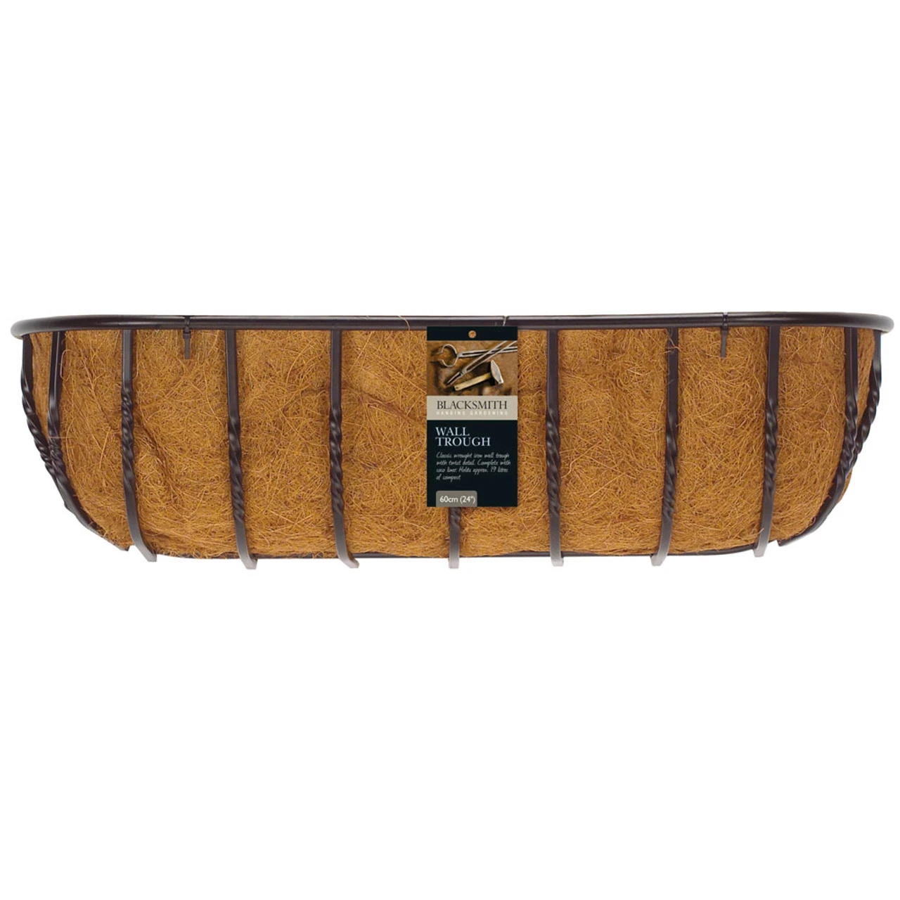 Blacksmith Wall Trough Specifications: – Classic wrought iron wall trough with decorative twist – Wall mounting eyelets – Complete with coco liner – Holds: 19 Litres of compost (approx.) Dimensions: 60cm