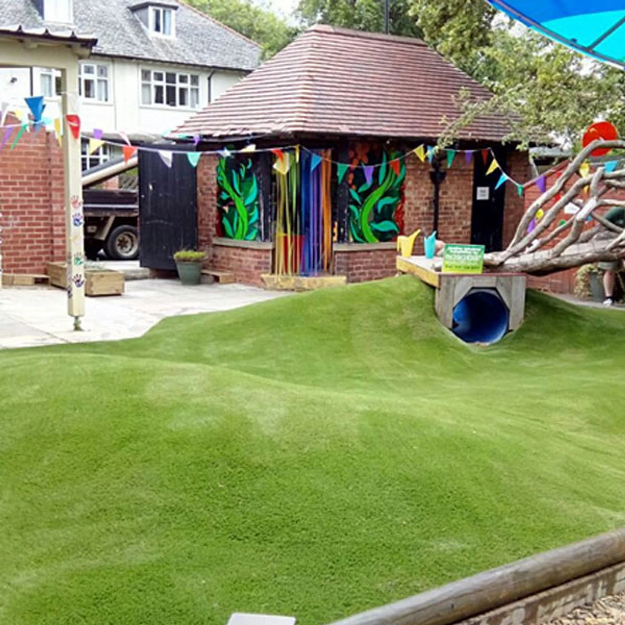 The Easigrass Kensington Grass range has been manufactured with a two-tone green C-shaped yarn. This extra thick, high-resilience support yarn is perfect for high-footfall garden and leisure areas, as its lawn fibre shape manages to stay more upright and requires less in the way of brushing and maintenance.