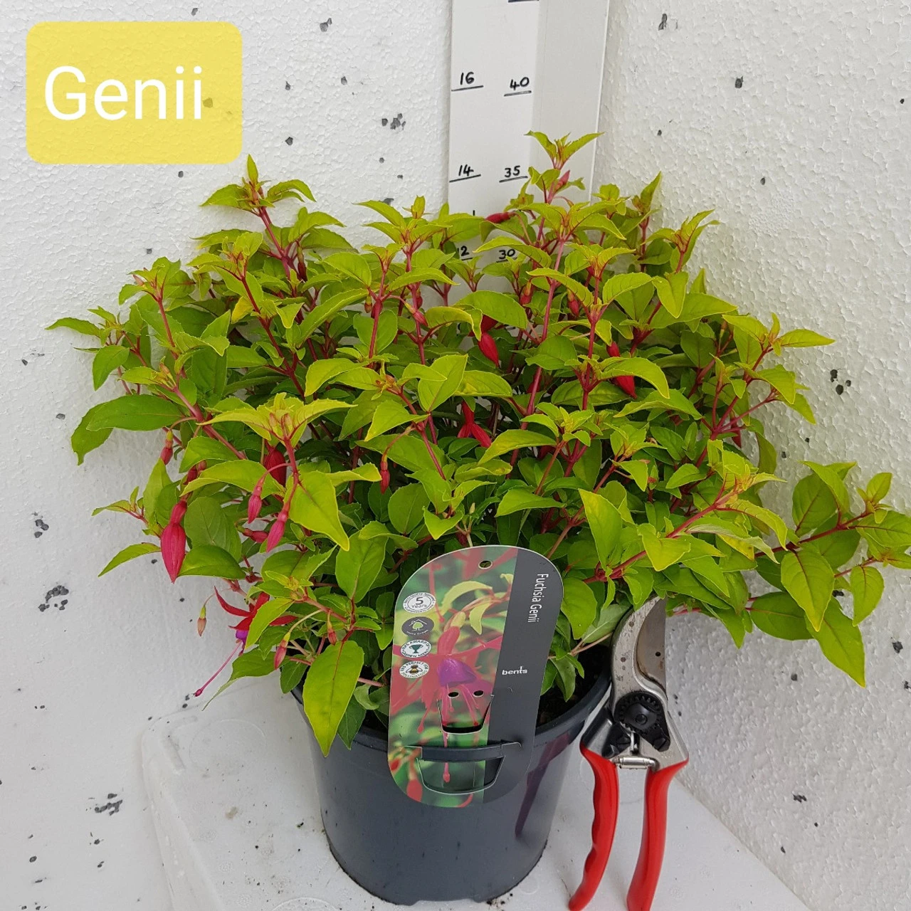 Fuchsia ‘Genii’ 3L An attractive variety with red stems and bright yellow leaves and slender flowers in purple and red – useful for adding a splash of colour for a long period to a border or pot. It can be pruned back hard in the spring in order to contain or rejuvenate it. Full sun may burn the gold leaves so it is better sited in partial shade. RHS AGM