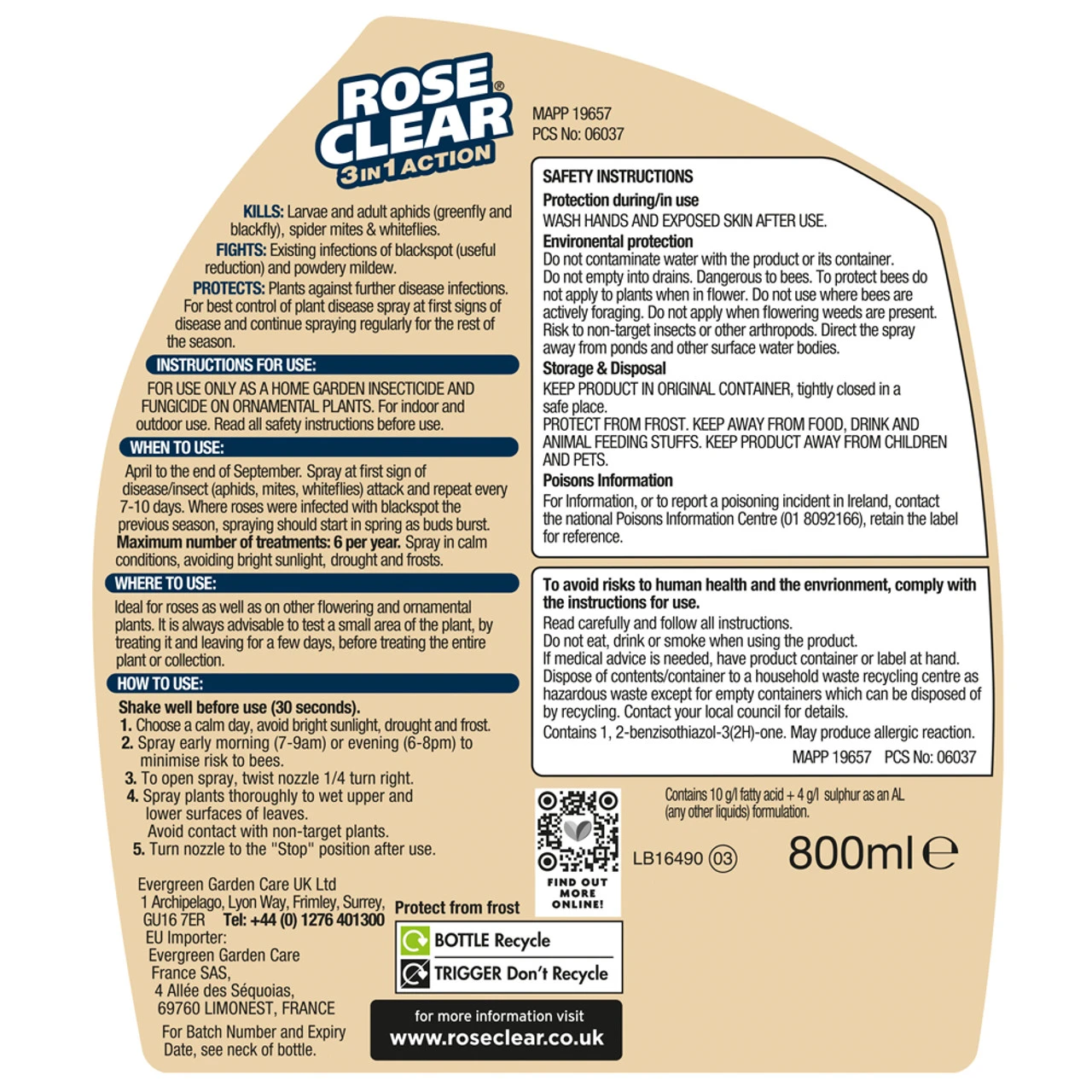 KILLS: Larvae and adult aphids (greenfly and blackfly), spider mites and whiteflies. FIGHTS: Existing infections of blackspot (useful reduction) and powdery mildew. PROTECTS: Plants against further disease infections. For best control of plant disease spray at first signs of disease and continue spraying regularly for the rest of the season.